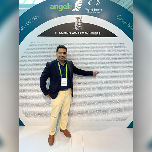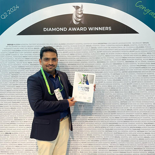 Stroke and Interventional Neurologist Dr Githin Benoy George , Head of the Department of Stroke & Interventional Neurology is accepting the award in the prestigious World Stroke Congress ( WSC 2024)held at Abudhabi, UAE